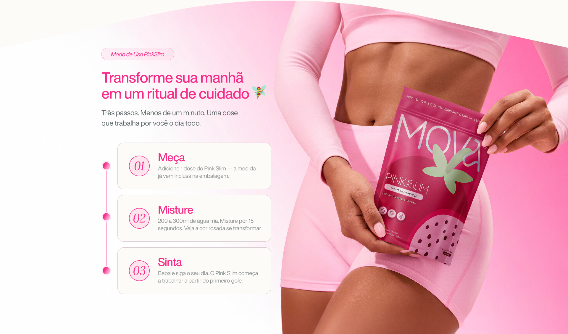 O Pink Slim é o seu novo suplemento favorito em pó. Mais de 38 ativos numa única porção — e só 3 calorias. Isso mesmo: tudo que o seu corpo precisa, sem abrir mão do sabor irresistível de Pitaya com morango.